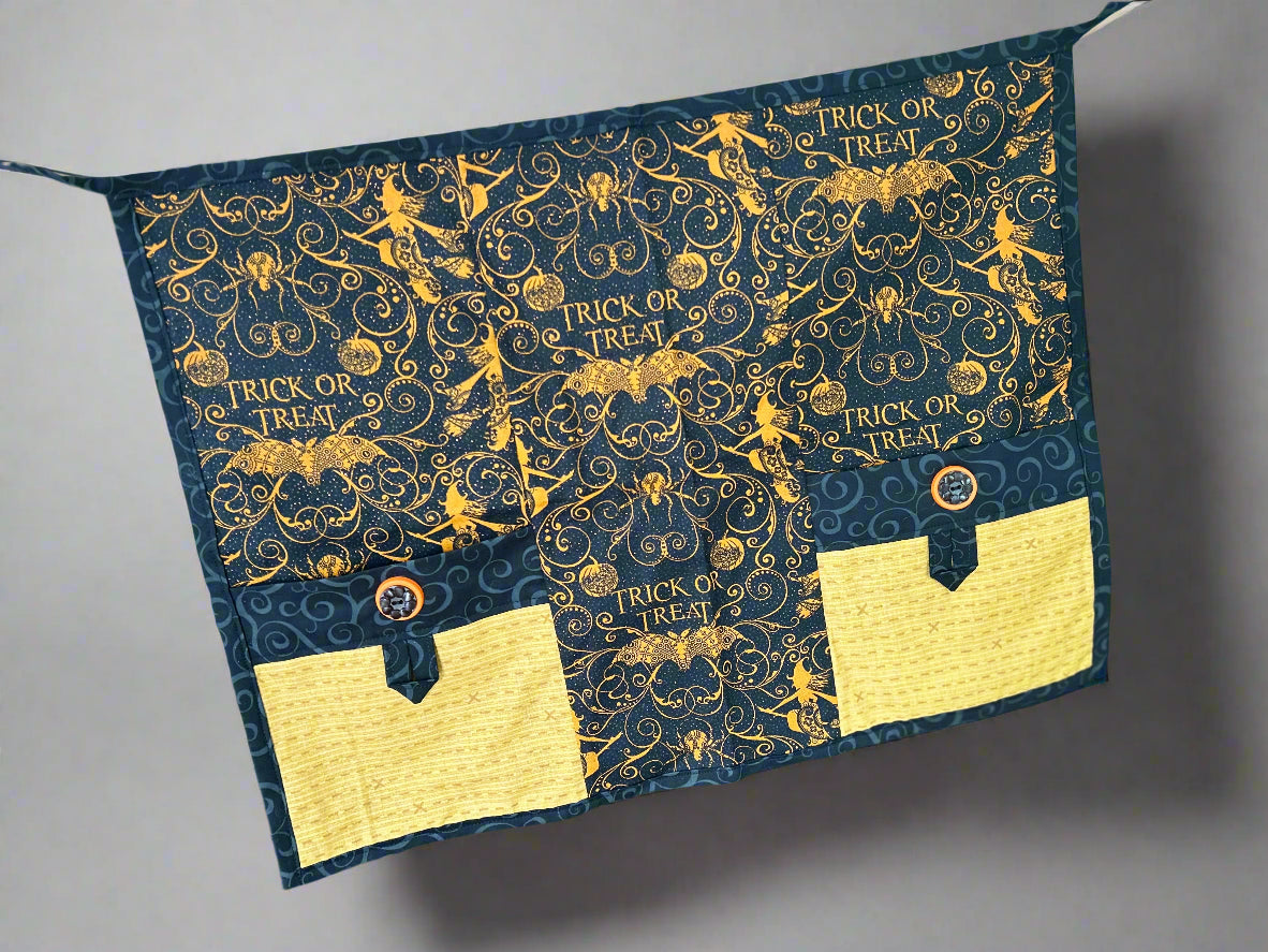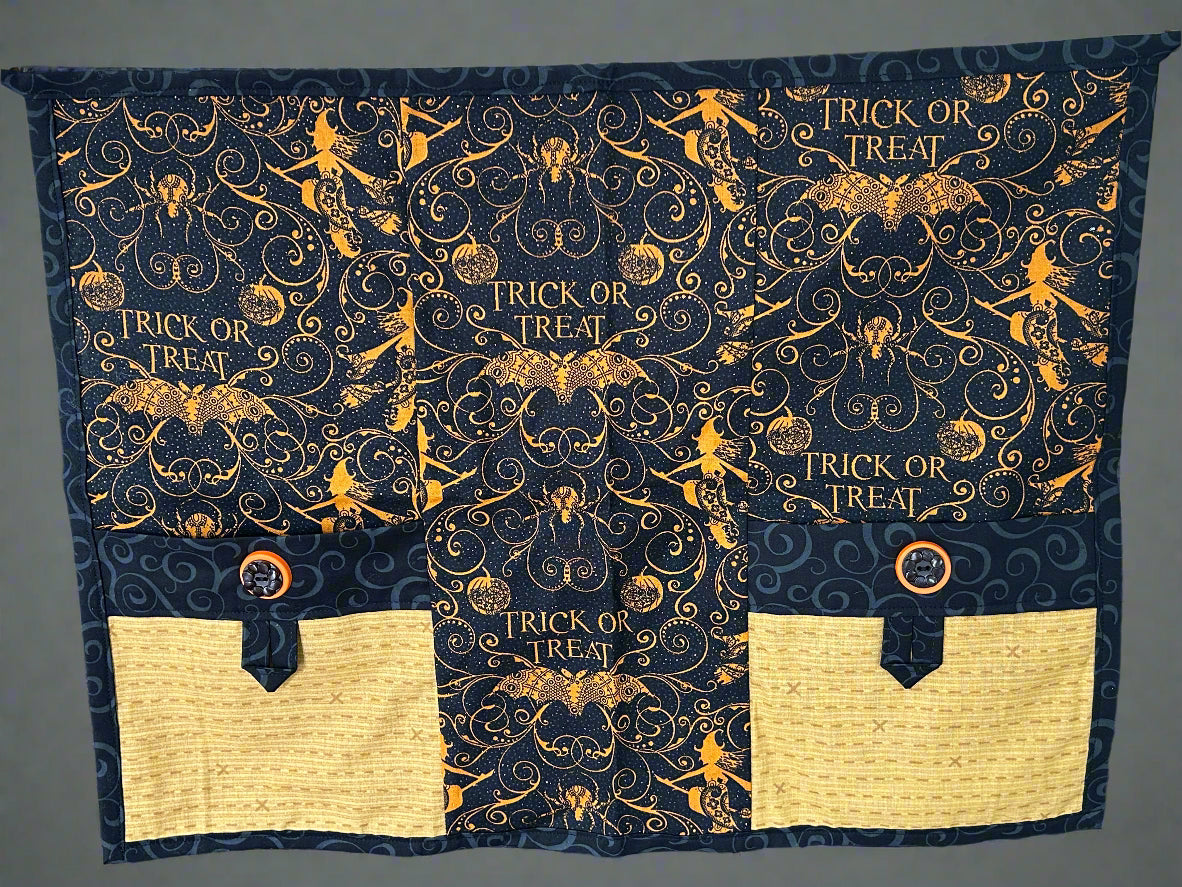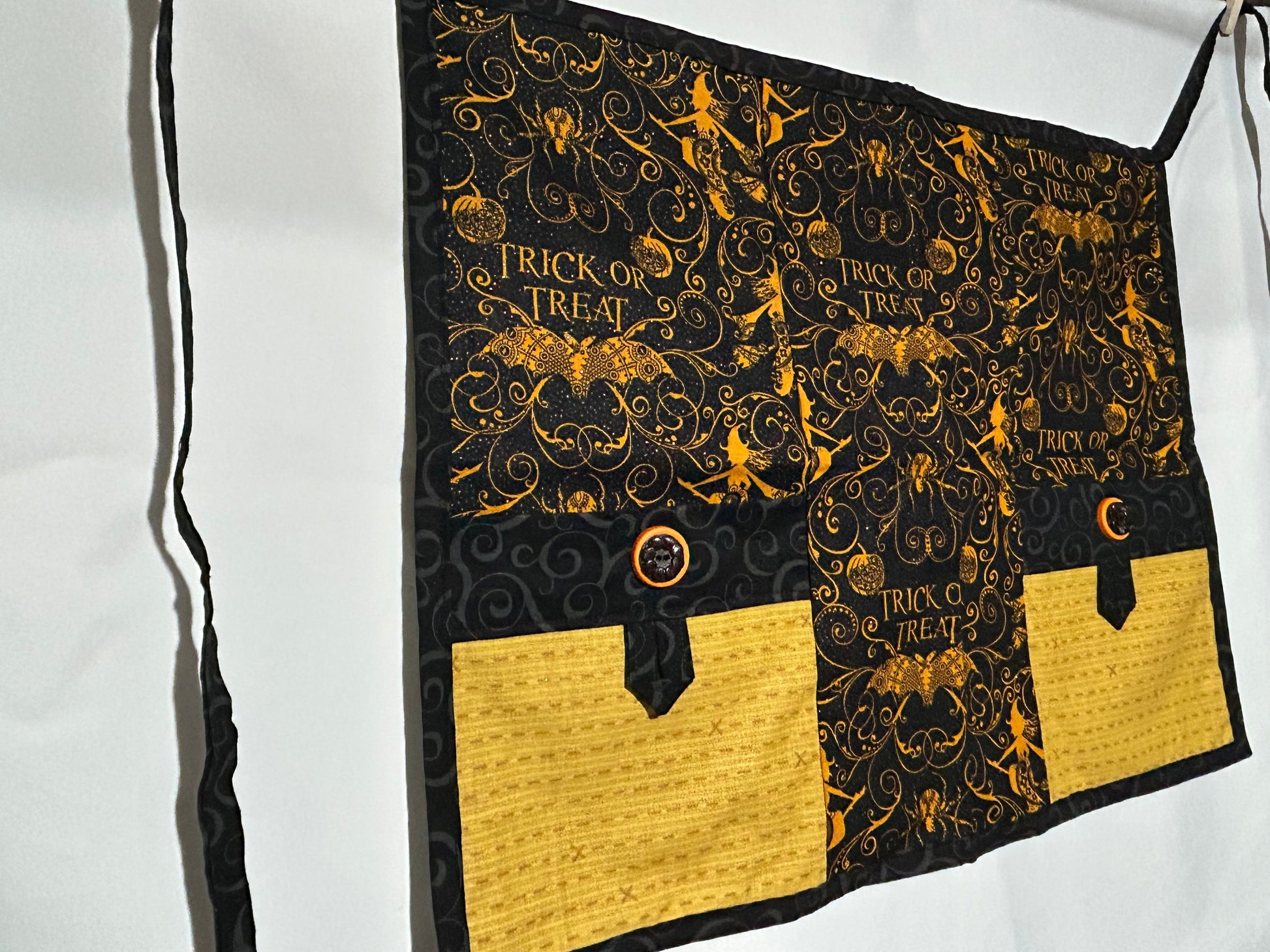 Add a spooky touch to your kitchen with this handmade Halloween-themed half apron. Featuring handy pockets for your utensils or treats, it’s perfect for cooking up some festive fun. Lightweight and charming, it keeps you stylishly protected while you brew your Halloween magic! (measurements: actual apron is 20" wide and 15" long, the ties are each 33" long, the 2 pockets are 6” x 6”)