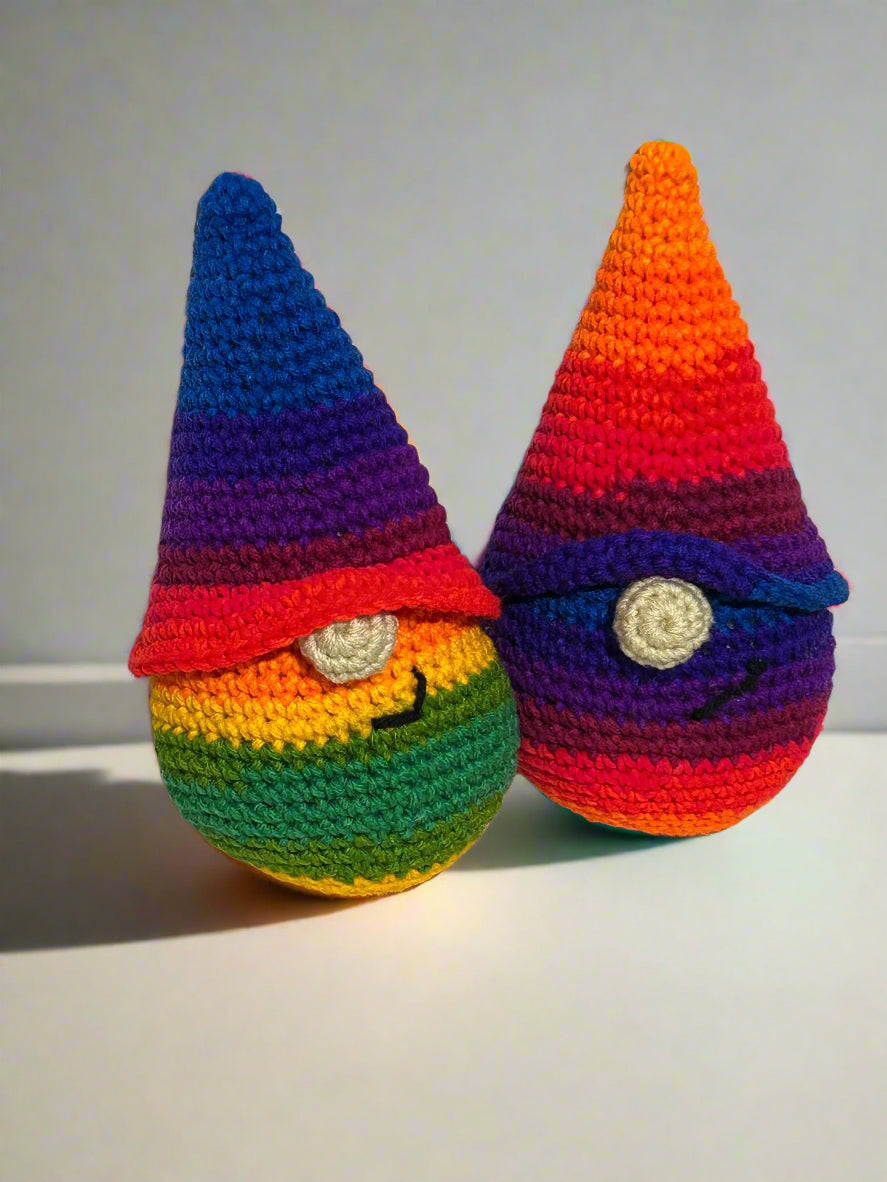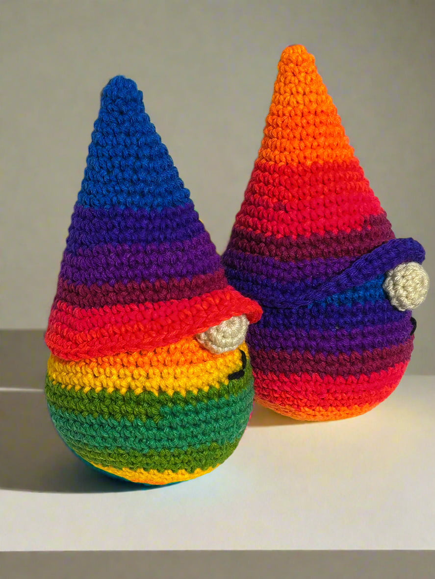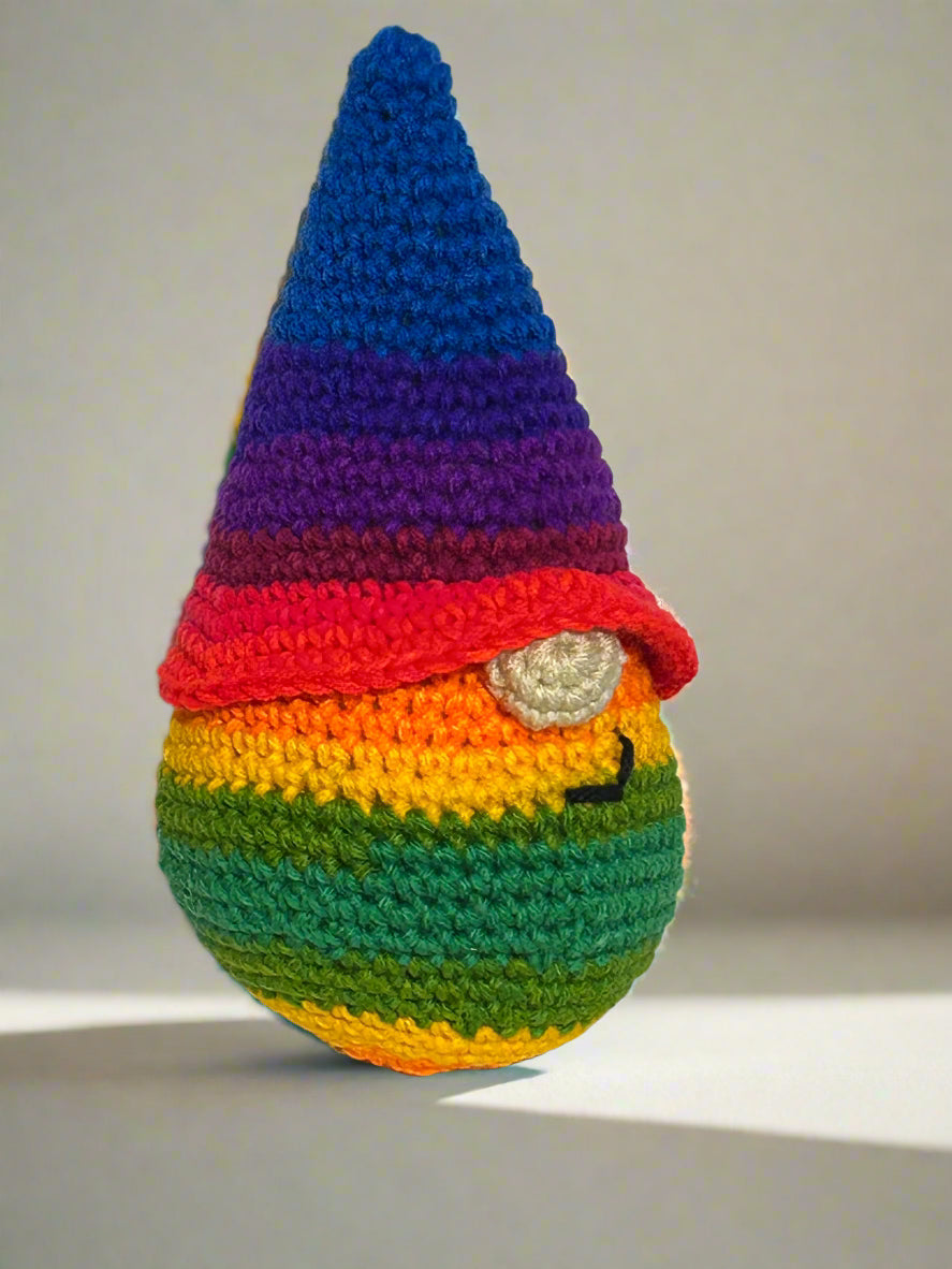 Celebrate love and joy with this playful Pride Gnome, featuring a vibrant rainbow design that brightens any space. Perfect for adding a touch of whimsy and pride to your home or anywhere else you want it to keep you company, this charming gnome spreads positivity and colorful cheer all year round. (Standing approximately 10" tall, this Pride Gnome is crafted from variegated yarn, ensuring each one showcases a unique blend of colors just like the examples in the photos.)