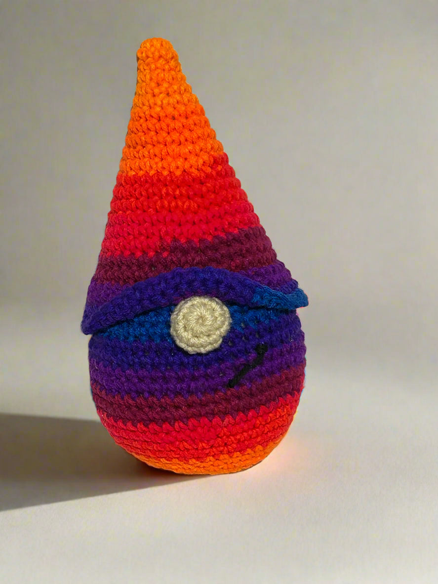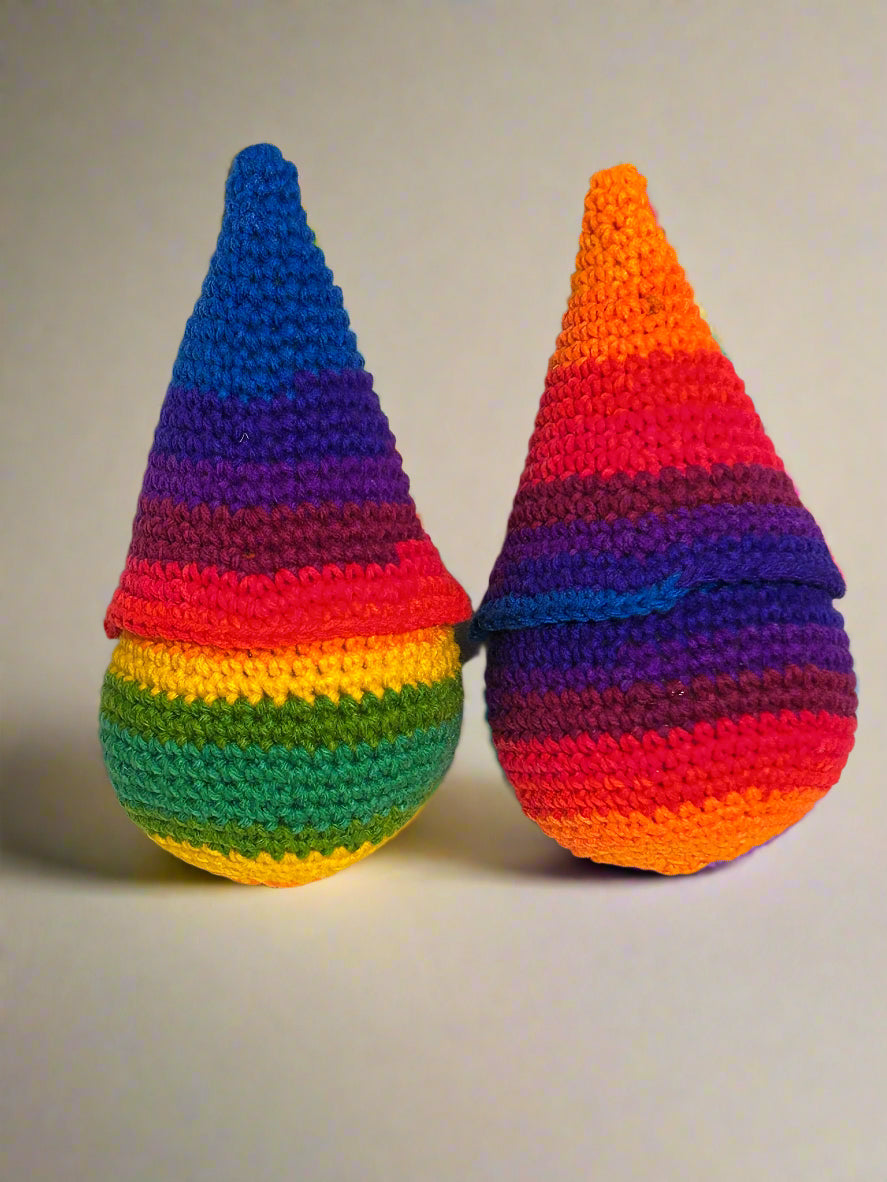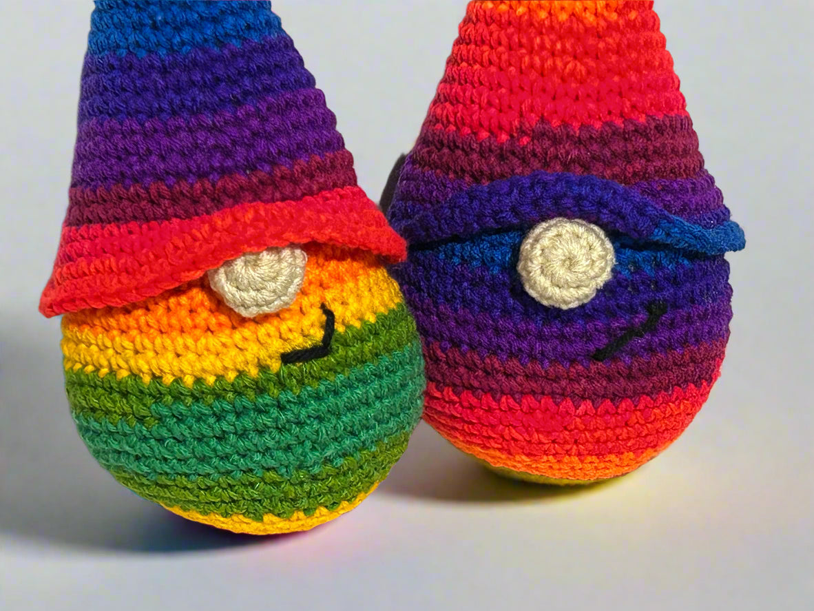 Celebrate love and joy with this playful Pride Gnome, featuring a vibrant rainbow design that brightens any space. Perfect for adding a touch of whimsy and pride to your home or anywhere else you want it to keep you company, this charming gnome spreads positivity and colorful cheer all year round. (Standing approximately 10" tall, this Pride Gnome is crafted from variegated yarn, ensuring each one showcases a unique blend of colors just like the examples in the photos.)