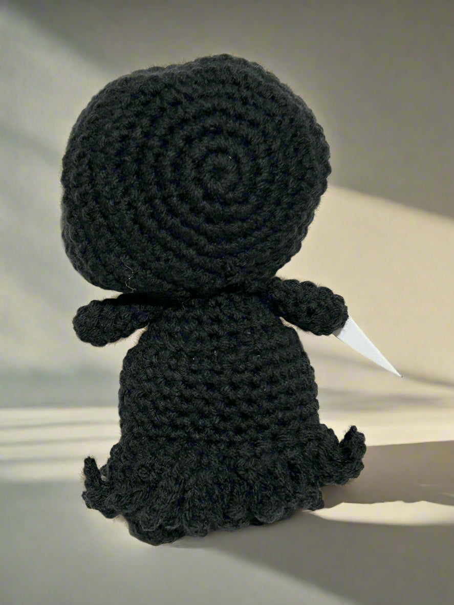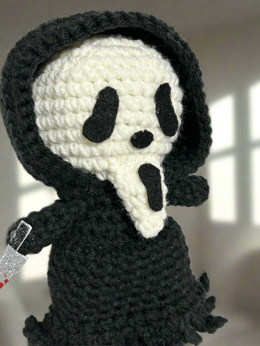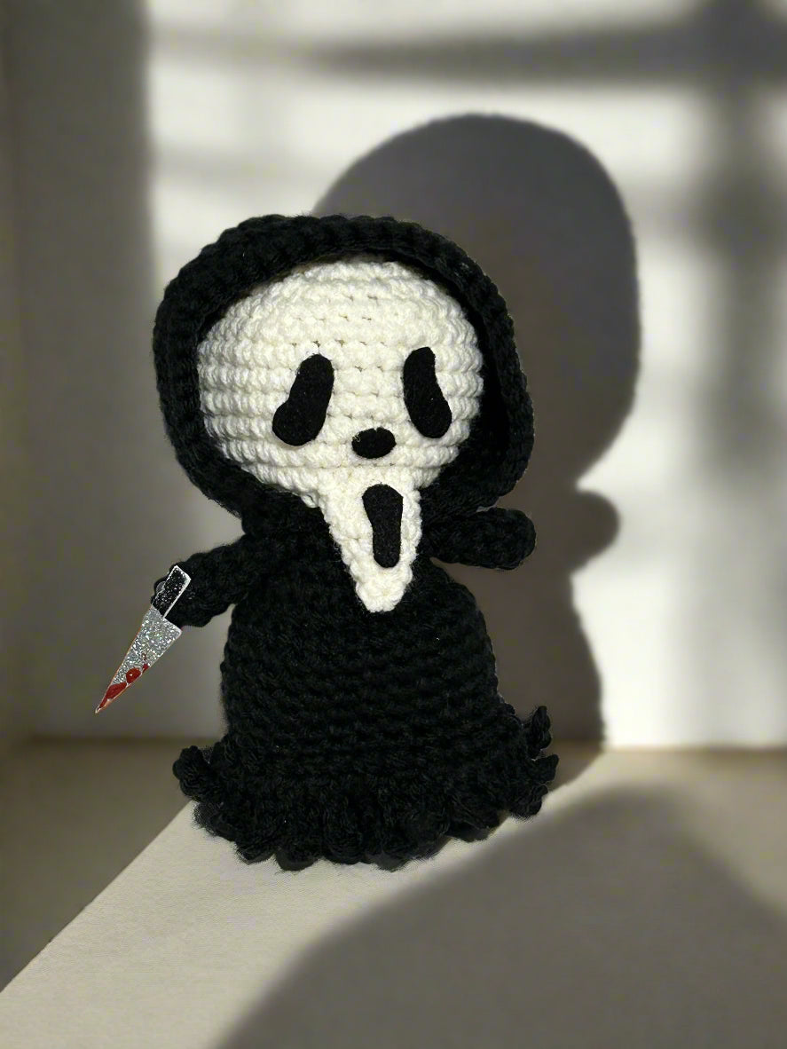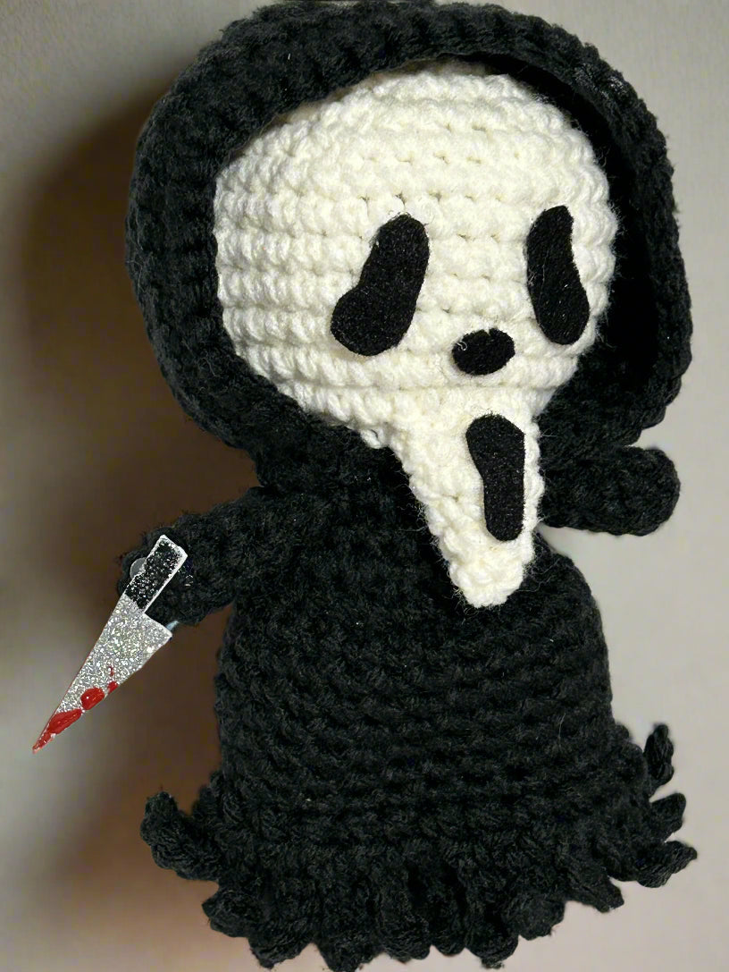 Meet the Screaming Snuggler, a delightfully creepy doll that blends cute charm with a spooky twist. Inspired by the iconic ghostface, this cuddly companion is perfect for those who love a little fright with their fun. Whether as a quirky gift or a playful addition to your collection, it’s sure to bring smiles—and maybe a few startled laughs! ((Measuring 8.5" tall, this little creeper is handmade, making each one very similar but not EXACTLY the same!)