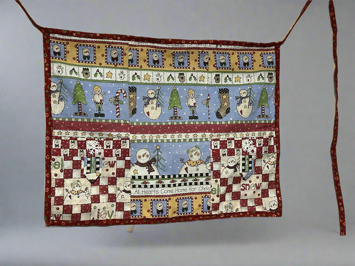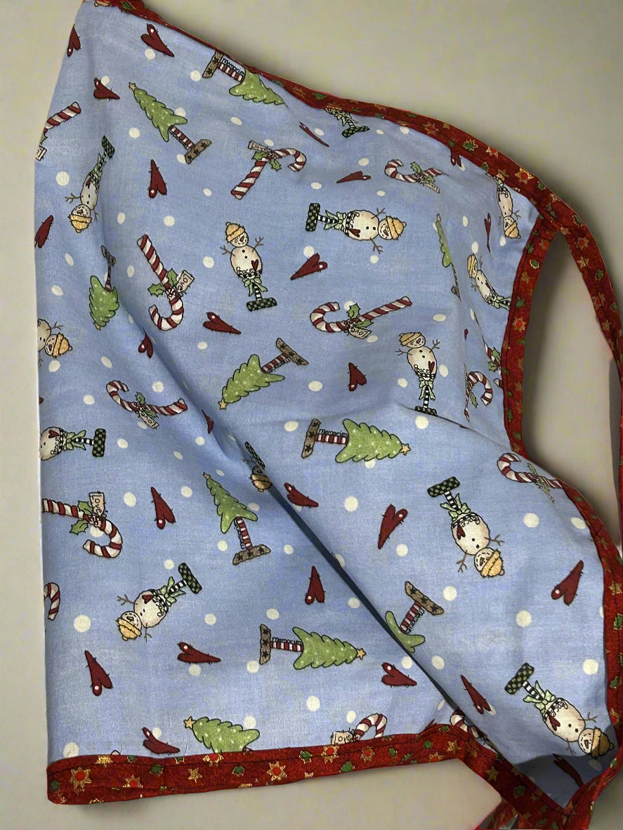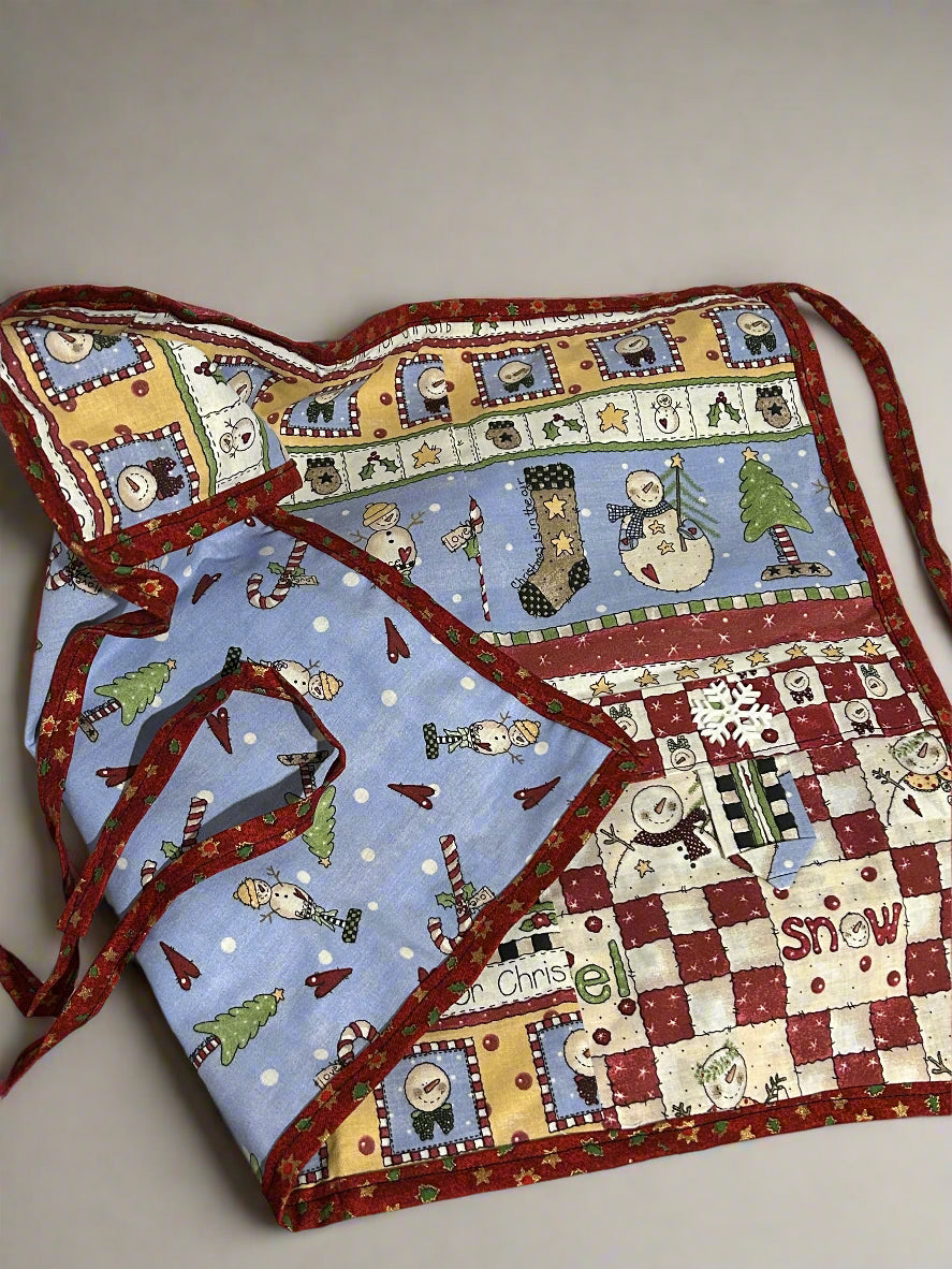 Get into the holiday spirit with this playful Snowman Half Apron! Perfect for festive cooking and baking, it features a cheerful snowman design that adds a touch of winter fun to your kitchen. Lightweight and easy to wear, it keeps your clothes clean while spreading holiday cheer. Ideal for holiday parties or cozy family gatherings. (measurements: actual apron is 20" wide and 15" long, the ties are each 33" long, the two pockets are 6" x 6")