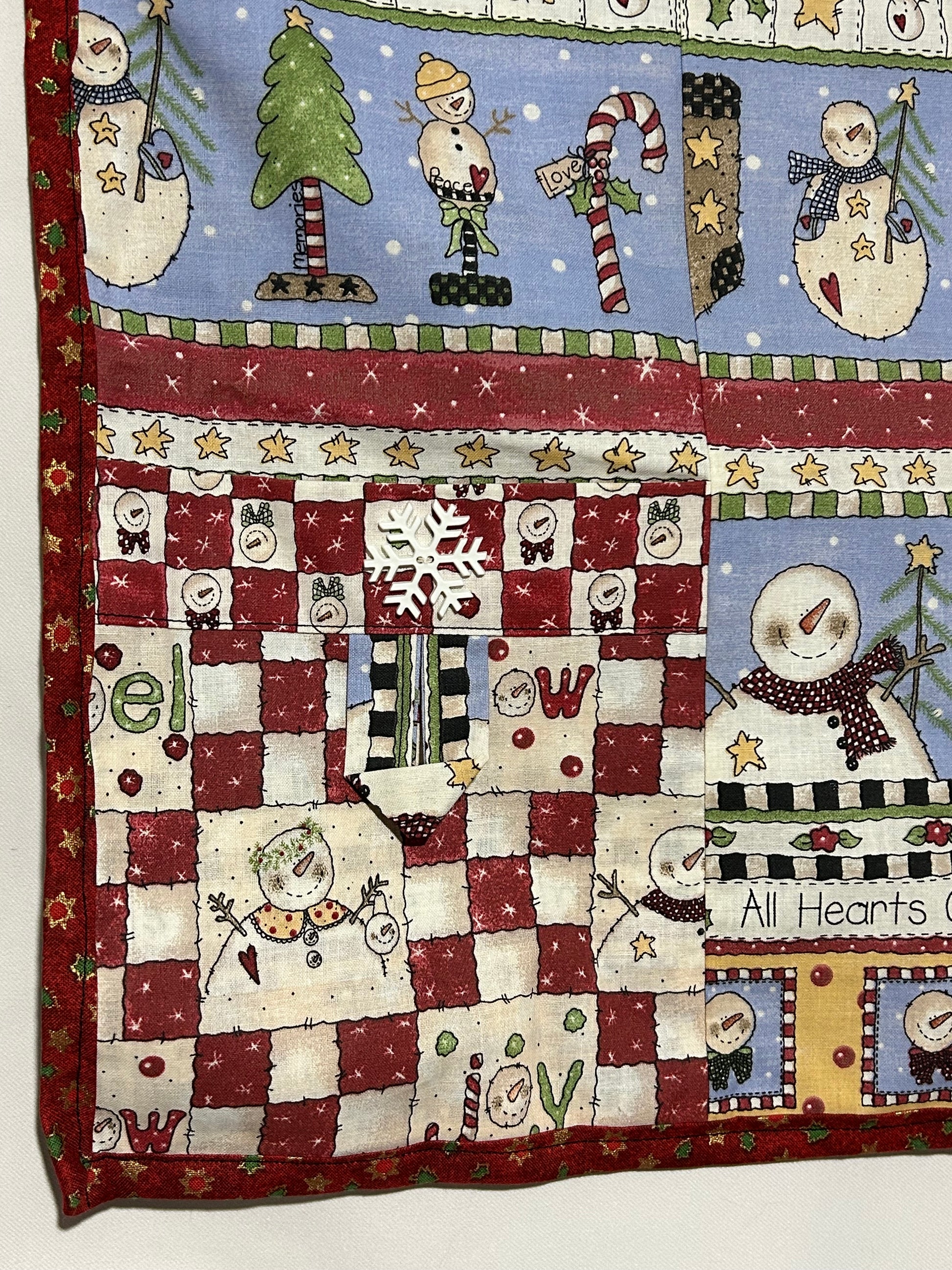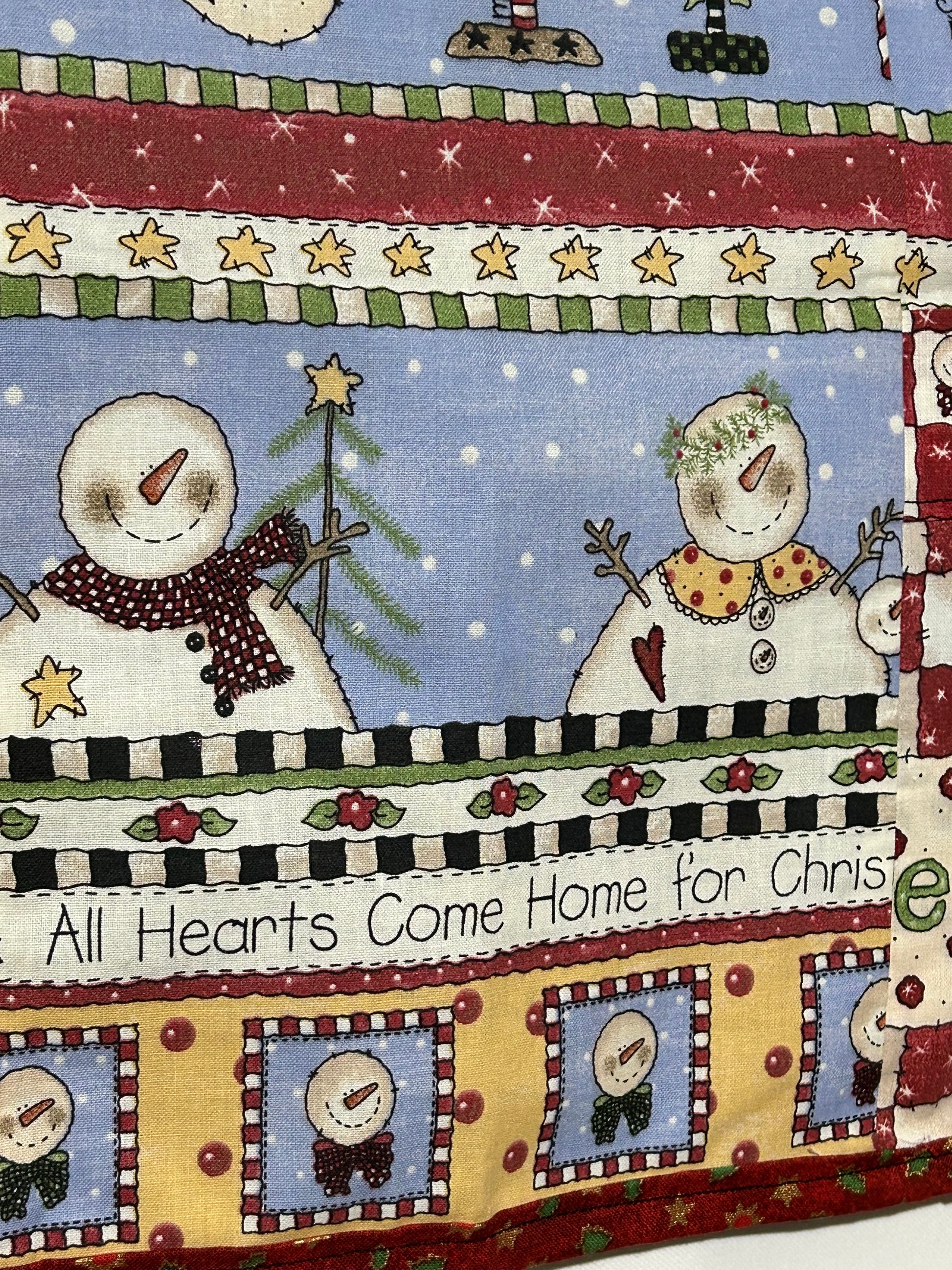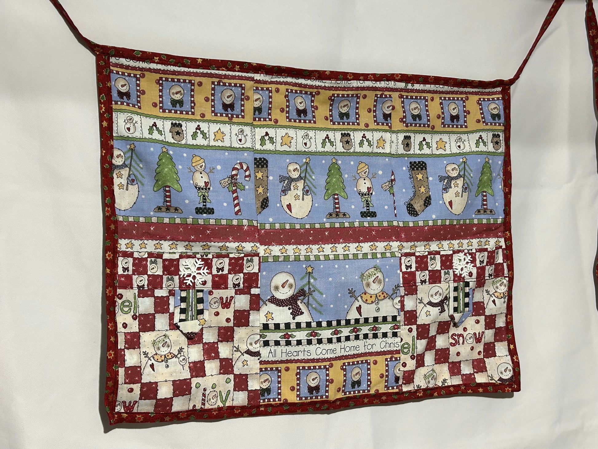Get into the holiday spirit with this playful Snowman Half Apron! Perfect for festive cooking and baking, it features a cheerful snowman design that adds a touch of winter fun to your kitchen. Lightweight and easy to wear, it keeps your clothes clean while spreading holiday cheer. Ideal for holiday parties or cozy family gatherings. (measurements: actual apron is 20" wide and 15" long, the ties are each 33" long, the two pockets are 6" x 6")