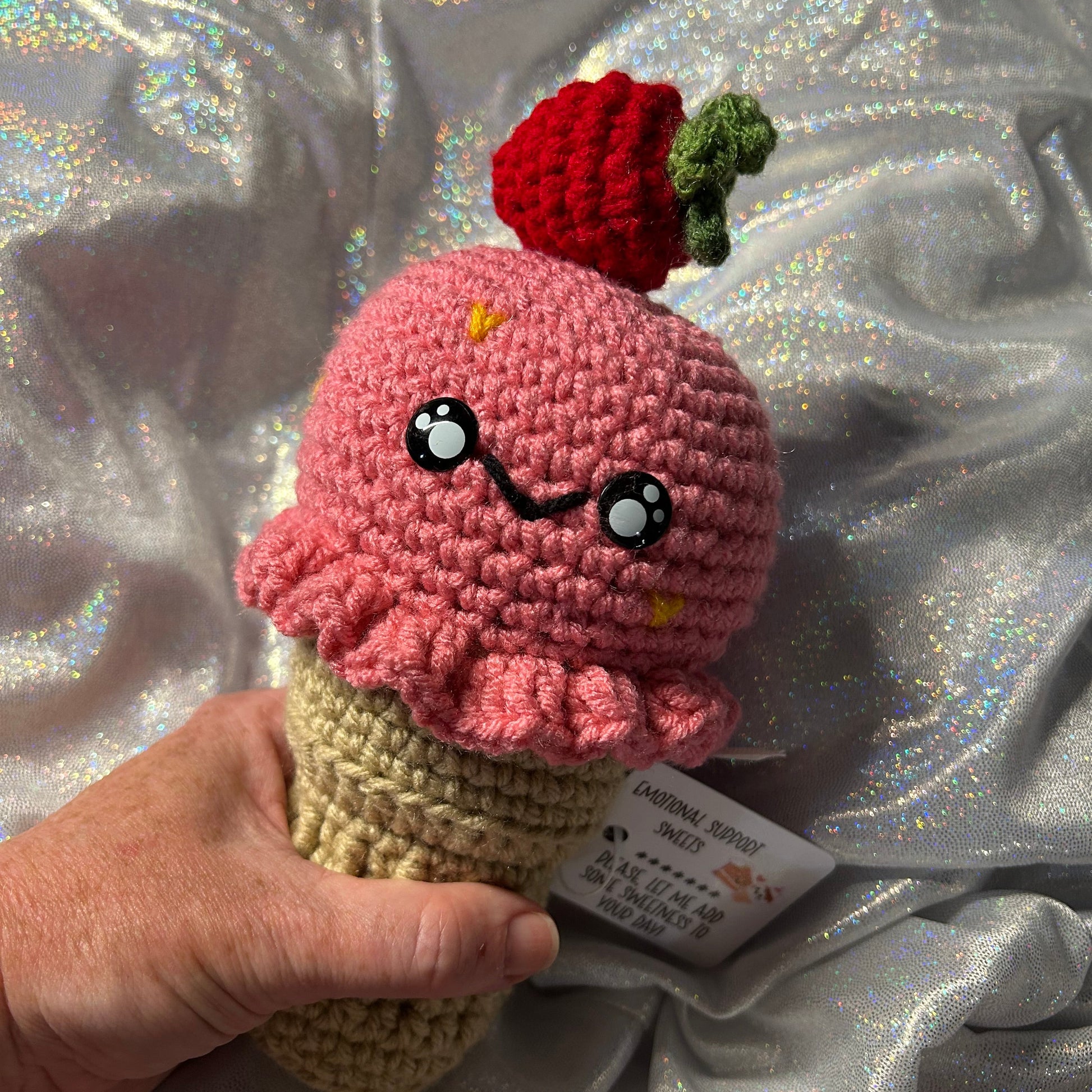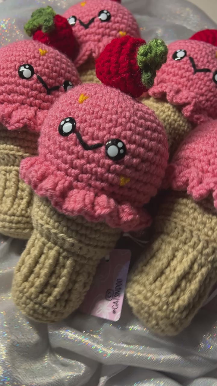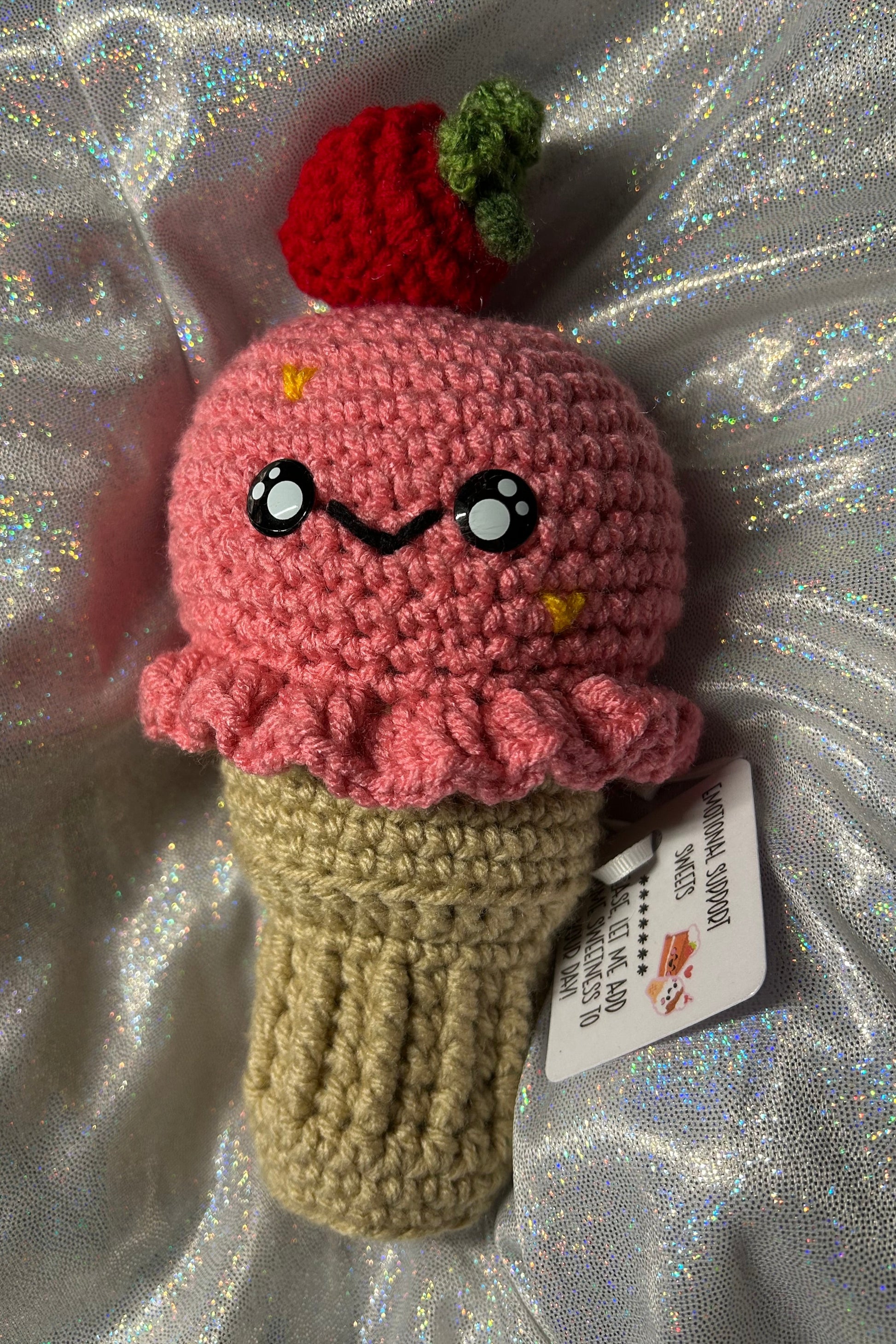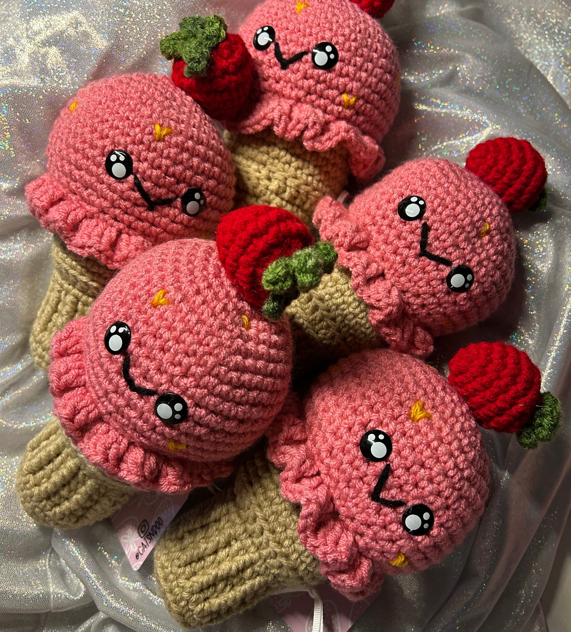 This adorable handmade crochet strawberry ice cream cone is the sweetest treat without the calories! Soft yarn and vibrant colors make it perfect for playtime or as a charming decoration. Bring a scoop of fun and whimsy to any room with this delightful, handcrafted delight. Each one is lovingly handmade, making every ice cream cone unique with its own special charm! (Measures 9.5" long)