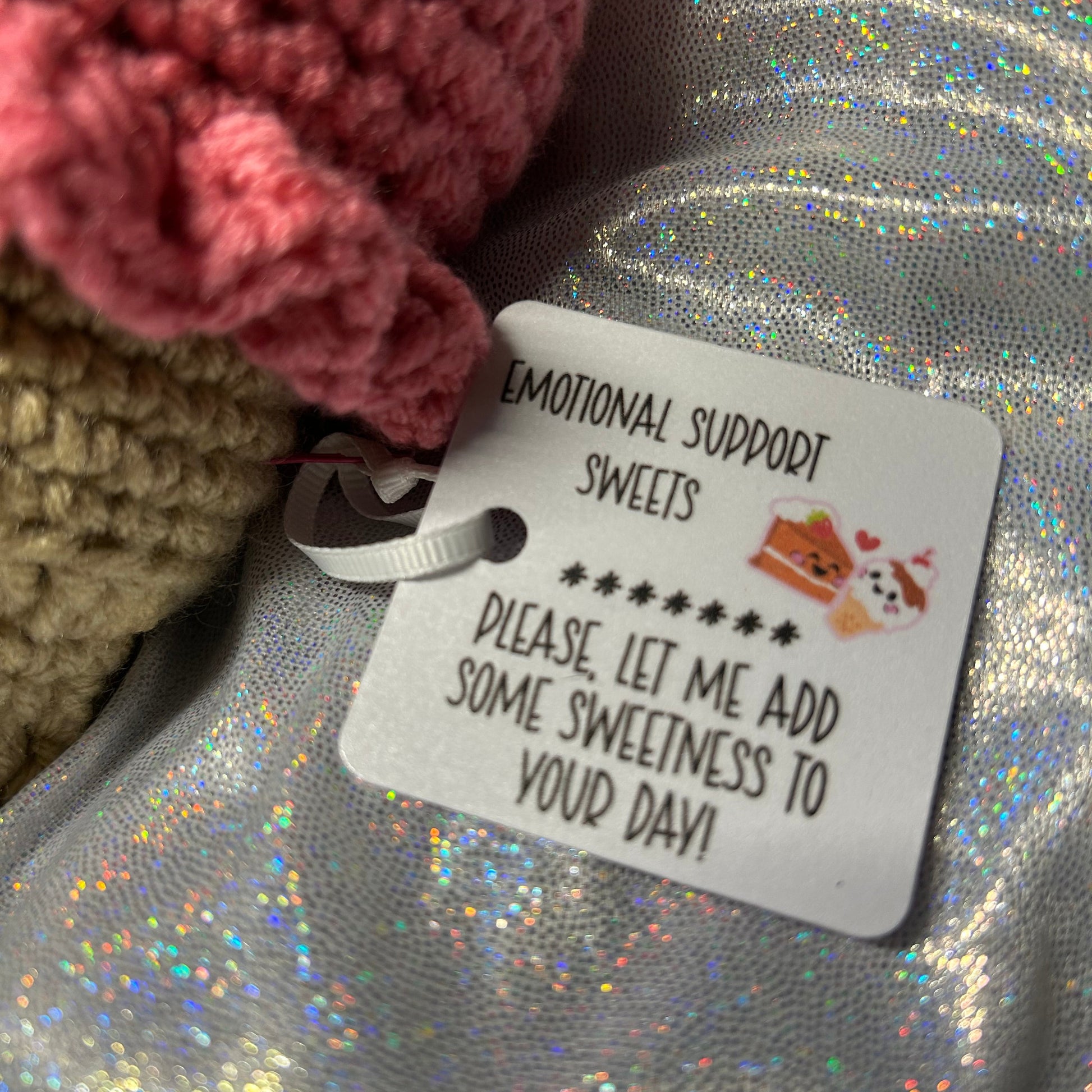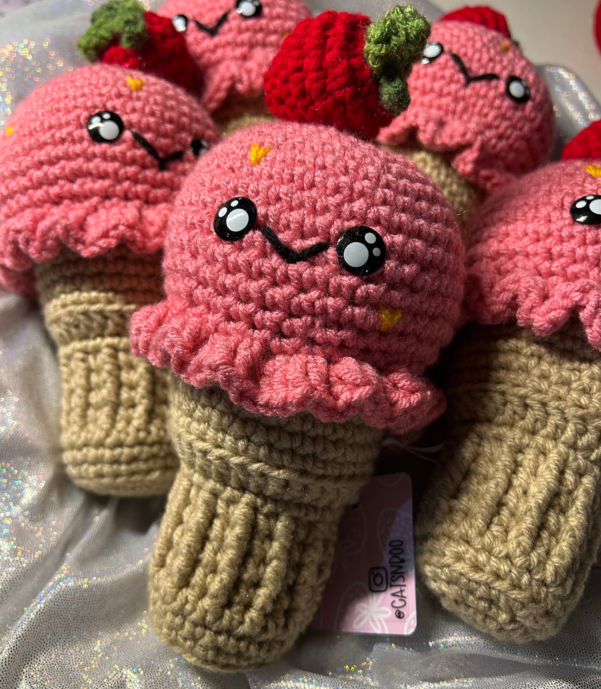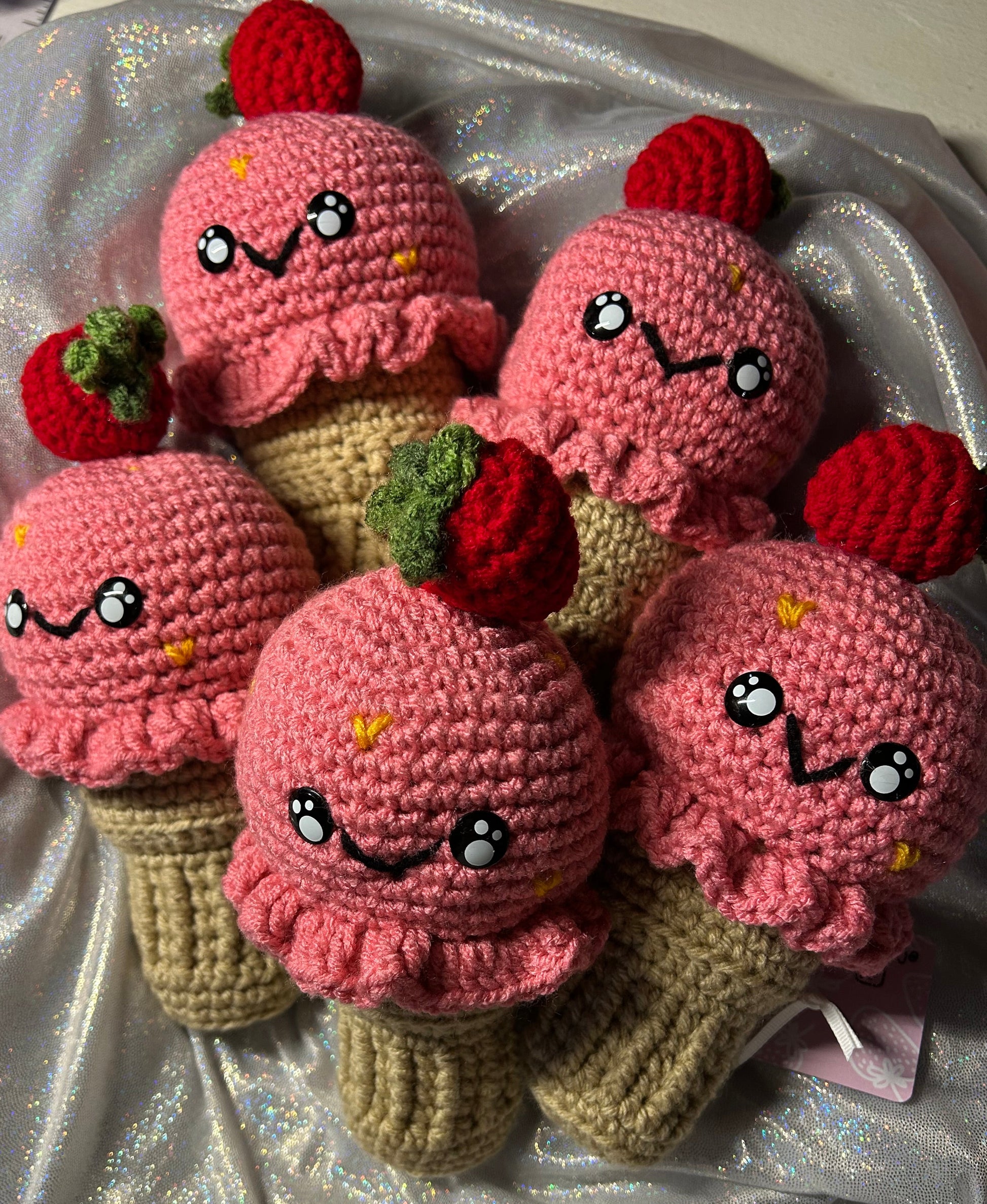 This adorable handmade crochet strawberry ice cream cone is the sweetest treat without the calories! Soft yarn and vibrant colors make it perfect for playtime or as a charming decoration. Bring a scoop of fun and whimsy to any room with this delightful, handcrafted delight. Each one is lovingly handmade, making every ice cream cone unique with its own special charm! (Measures 9.5" long)